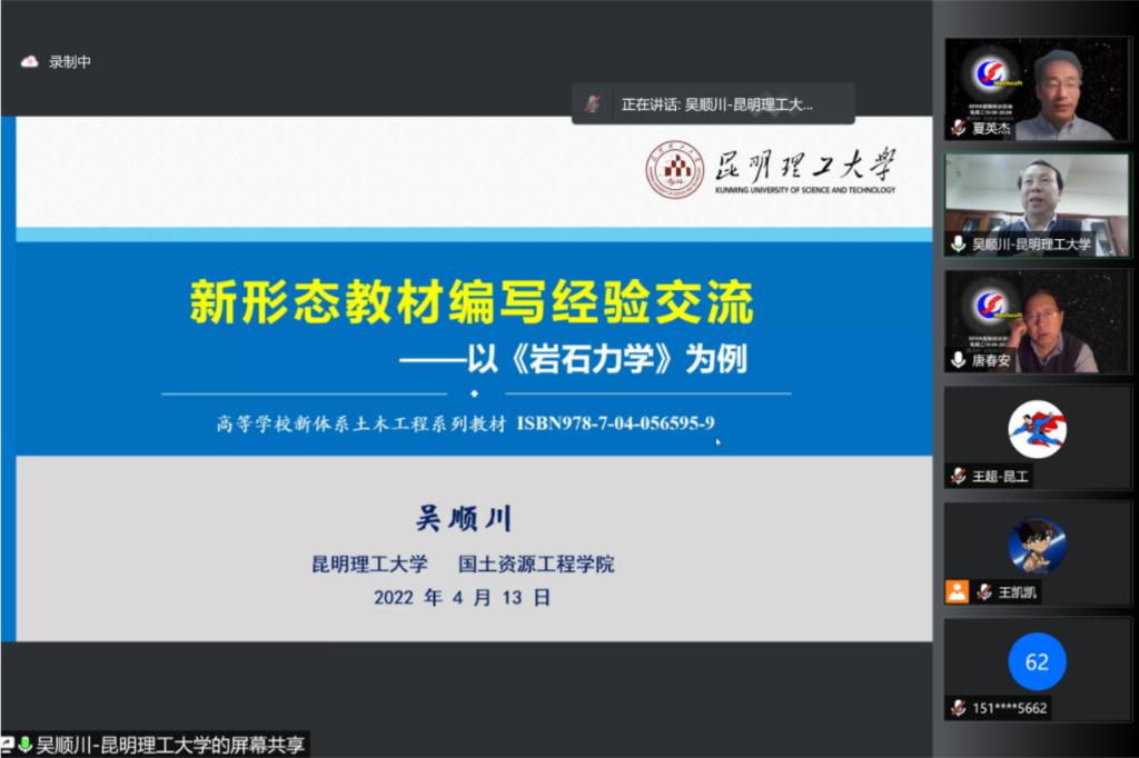 吴顺川教授在Mechsoft讲堂作了题为“新形态教材编写经验交流——以《岩石力学》为例”的学术报告,600余人通过腾讯会议或“仿真秀”直播平台参加了报告会。