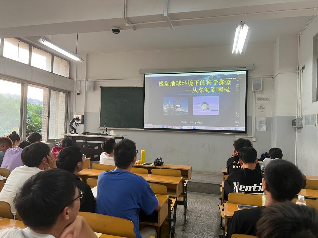 “搭蛟龙探海,乘雪龙破冰”,唐丽梅博士结合自身科研工作经历,生动地讲述了如何进行海底和南极地质考察与研究,增进了同学们对于生命起源、海洋和冰川地质作用的认识。她表示,在科考探索的过程中感受到人类在自然面前的渺小,也因此不惧怕生活、学习和工作中遇到的困难。她鼓励学生们努力奋斗,保持理想,在奋斗中实现价值,这才是青春该有的样子。当看到国旗在南极科考站飘扬,深海“蛟龙”与太空“神九”实现“海天对话”,一幕幕中国科学发展的壮举激励着在场的每一位师生。同学们聚精会神,深受启发和鼓舞,在学习专业知识的基础上,进一步增进了专业兴趣和爱国主义情怀。
