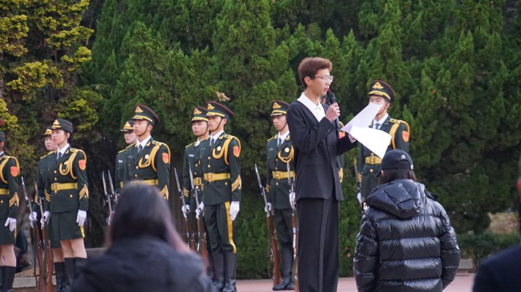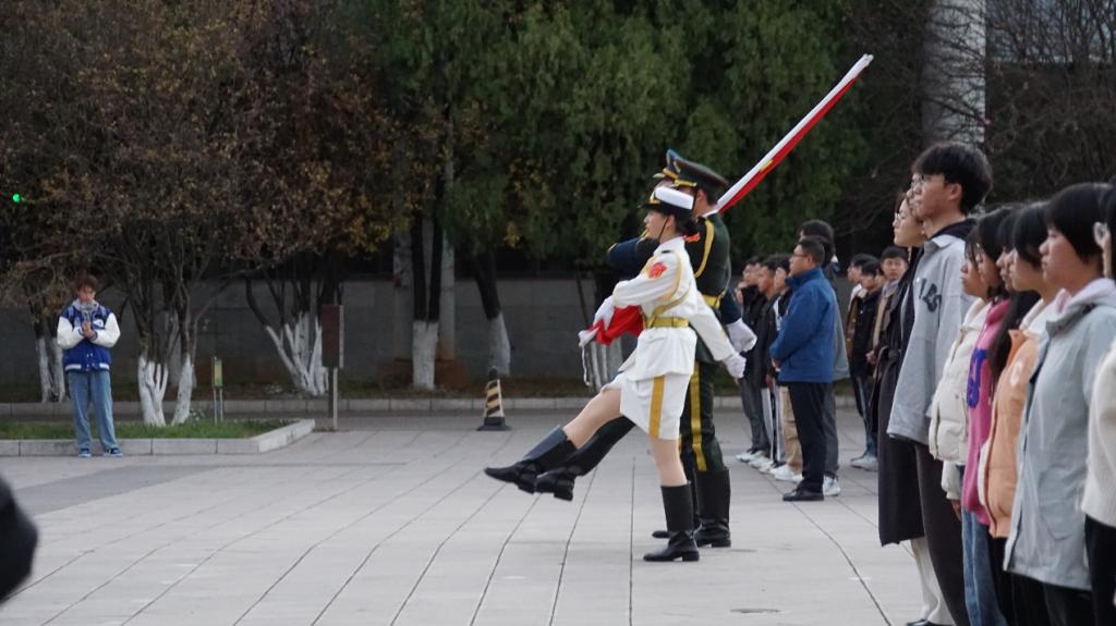 仪仗队成员参与主持了此次升旗。步履铿锵,形色果敢,入场的一步一趋是他们脚踏实地的坚强;升旗时的瞩目不方,目光似炯,是国资学子许身报国的不绝理想。