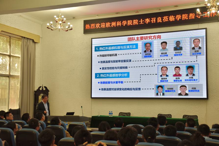 “国家高层次人才”特聘教授唐伯惠主持报告会议。唐伯惠教授热烈欢迎了李召良研究员一行的到访,并对其到访和分享关于地表温度热红外遥感最新研究进展表示感谢。